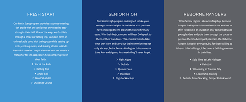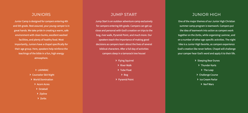 Six exciting programs are running simultaneously each week for campers entering 4th-12th grades. 2023 High School graduates are welcome too!